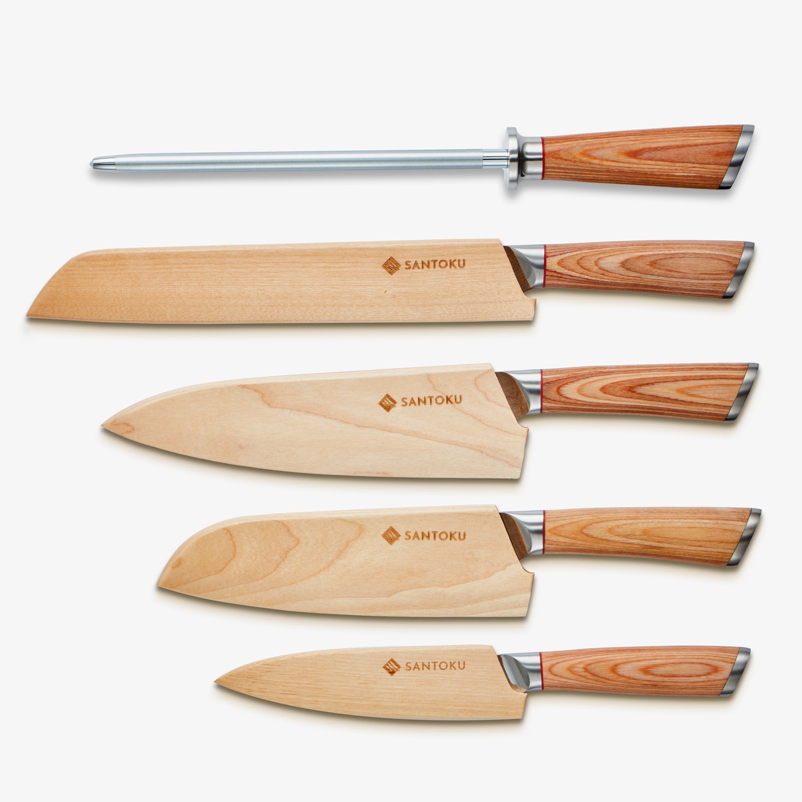 • 5-inch Utility,  7-inch Santoku,  8-inch Gyuto, 10-inch Bread, and 13-inch Diamond Sharpening Steel.