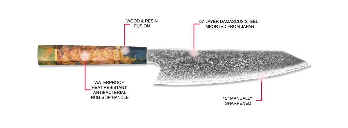 - 8.5-inch Chef, 8-inch Butcher, 8-inch Kiritsuke, 7-inch Santoku, and 7-inch Nakiri options.