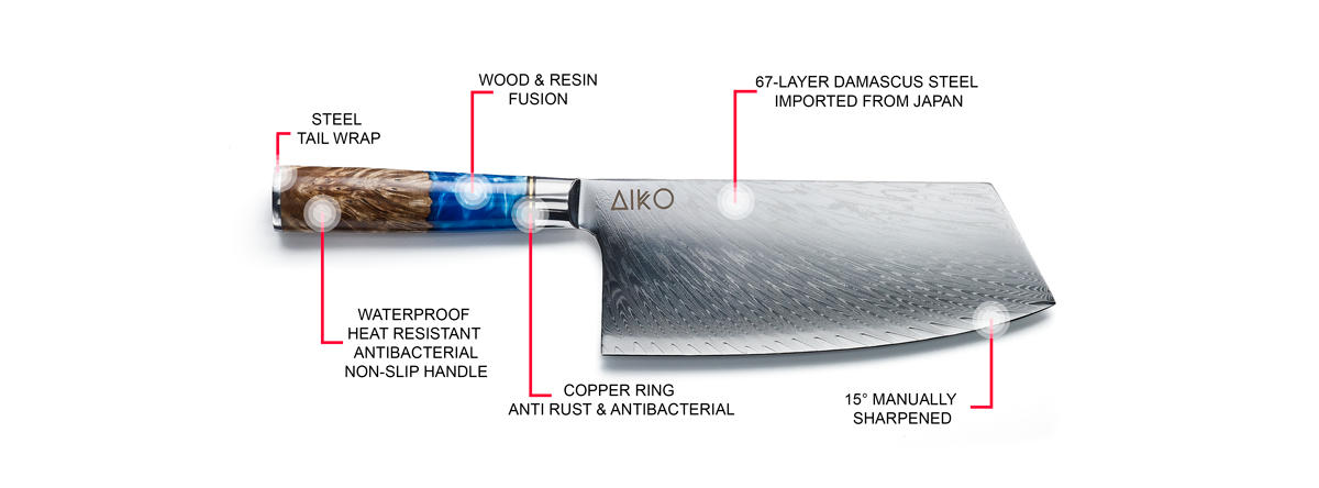 Cuchillo de acero de damasco azul aiko con mango de resina azul de color